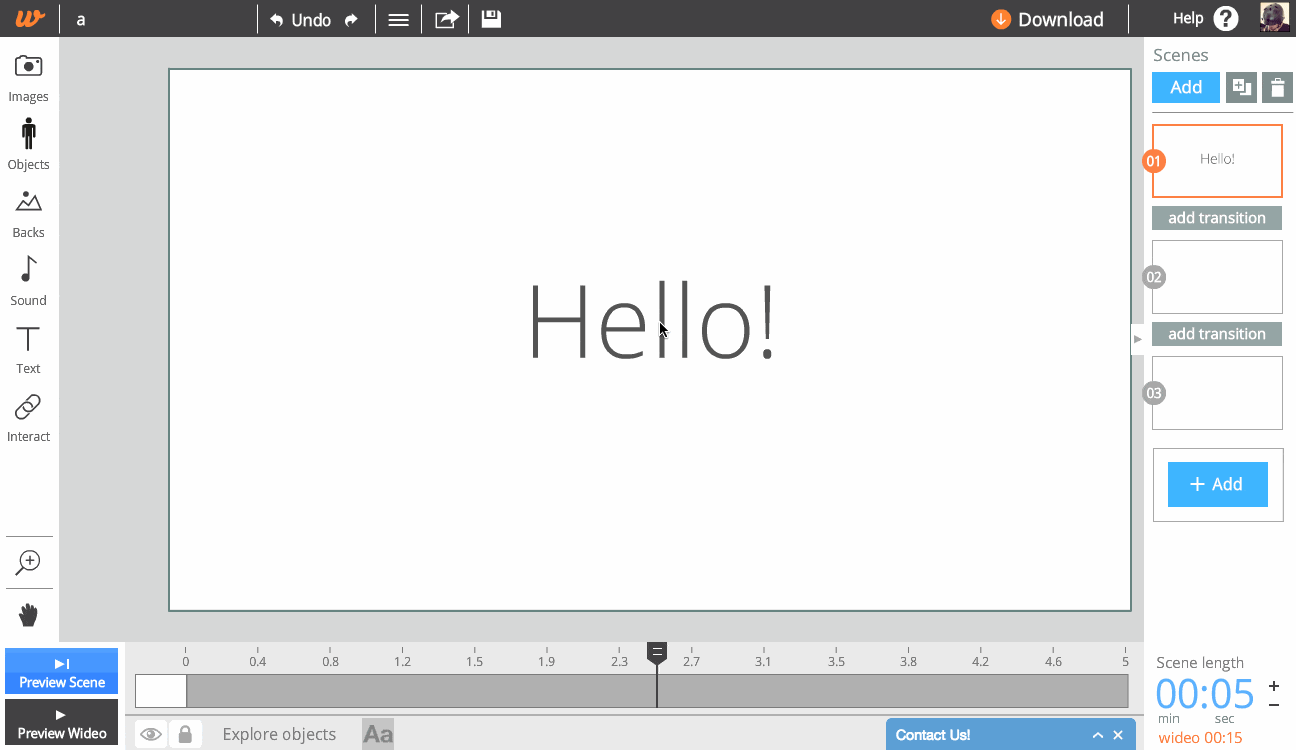 Puedes utilizar las animaciones automáticas (in/out) que Wideo ofrece para darle entradas y salidas dinámicas a los objetos muy fácilmente y también agregarle transiciones automáticas a todas las escenas.