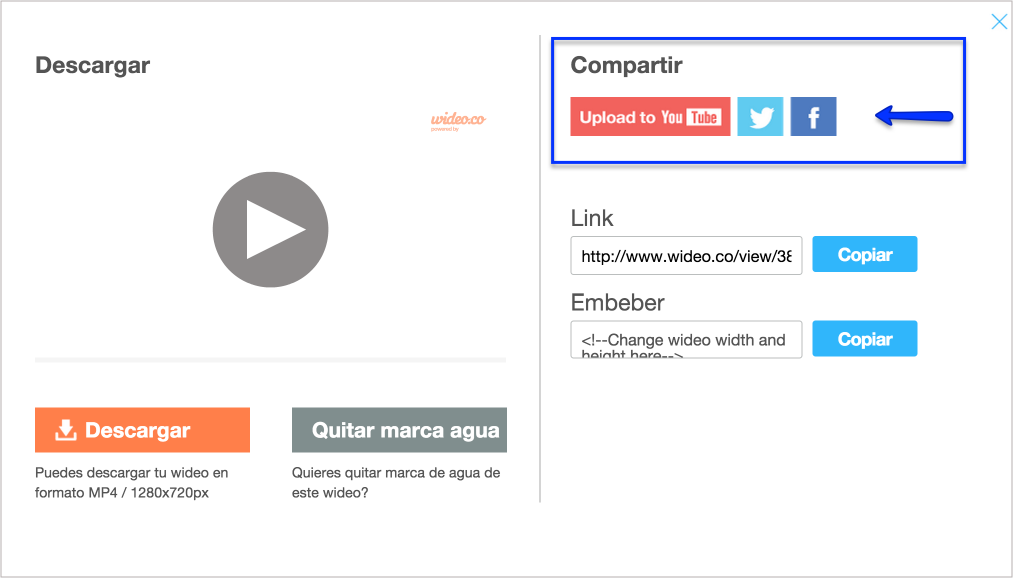 En Wideo, hemos notado el poder inmenso de las redes sociales a la hora de compartir un video. Por eso, puedes generar un link para YouTube, Facebook y Twitter o embeber tu video en un sitio cuando haces clic sobre el botón “Compartir”, directamente del editor de Wideo.